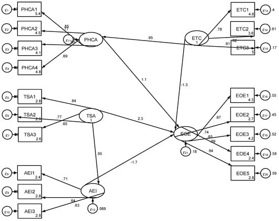 After an analysis of the exploratory factors and a regression analysis, we proposed the research model (Figure 2), provided that the standardized loadings are at least 0.400. Moreover, there were no loadings on several factors (β > 0.35). Thus, the next step indicates the estimated measurement model using the confirmatory factor analysis (CFA).