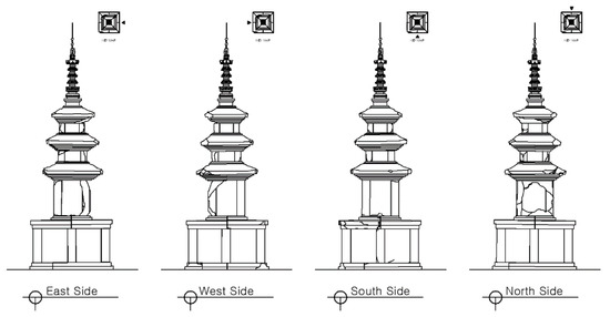 The three-story stone pagoda at the Cheollyongsa temple site was severely damaged by the 2016 Gyeongju earthquake. The stone pagoda is 2.43 m wide and 7.24 m high (the decorative top starts at 4.8 m) and is a representative, single-stylobate stone pagoda of the late Unified Silla Dynasty. The stylobate is composed of 17 sheets, including the foundation stone, with the main body comprising 6 sheets (1 for each story), and the upper part comprising 16 sheets (Table 1) [15]. Figure 1 shows the elevation of the three-story stone pagoda at the Cheollyongsa temple site.