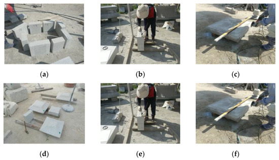 Third, the sliding of the upper member was investigated. Because the vertical load on the bottom of the upper member was small, the friction resistance on the sliding decreased and the upper member was horizontally moved. Processing roughness on the contact surface or installing a binder on the contact surface in Figure 12c,f can be used to increase the friction of contact surface and to prevent the sliding.