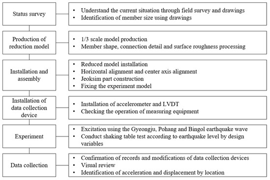 The effective ground acceleration and ground conditions were considered by the KDS 41 17 00 [15]. The details of the input earthquake waves are presented in Table 10. The input order of earthquakes was determined by spectral accelerations of the response spectrum of each earthquake. Table 10 shows the input order from small to large earthquakes. Between the experiments, the accelerometer and displacement gauge were adjusted to zero, and relative displacements and cumulative displacements were measured.