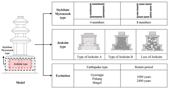 The pagoda models as shown in Figure 4 were classified as Jeoksim type A, Jeoksim type B, or loss of Jeoksim. Here, Jeoksim means soil and gravel surrounded by stylobate stones. Jeoksim A models were characterized by large, regularly stacked stones aligned along a central axis, and filled with soil and stone. The Jeoksim B model included irregularly stacked stones of various sizes compacted with soil. The loss of Jeoksim model was characterized by a partial loss of the stones in Jeoksim B type regions.