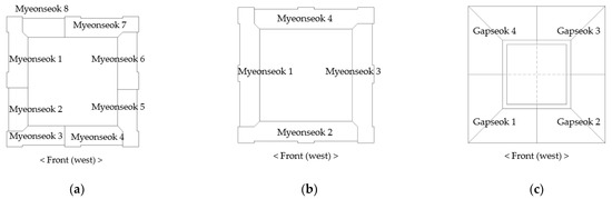 Installation locations of measuring equipment are shown in Table 6. Displacement gauge/accelerometer units were installed on the foundation stone (n = 1), Myeonseok (n = 2), Gapseok (n = 2), each main body stone and roof stone (all n = 1), and the decorative top (n = 1). All units were installed in the excitation direction, at the center of the member, and numbered.