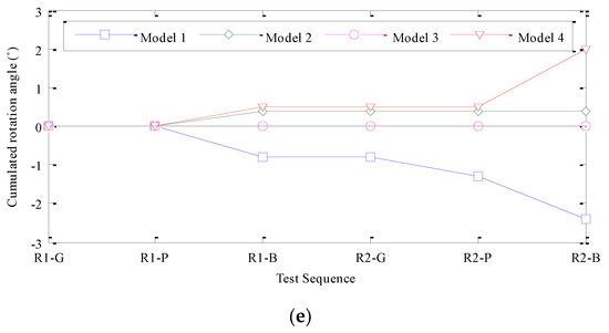 Images showing the deformation of the main body stone in the various models: (a) model 1; (b) model 2; (c) model 3; (d) model 4; and (e) cumulative rotation angle of the first-story main body stone.