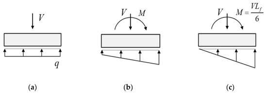 When only vertical loads were applied to the unit member, the forces were compressive [Figure 9a] [17]. When the moments acted with the vertical loads, the load distributions were as shown in Figure 9b. As the moments increased, the load distributions changed [Figure 9c]. When the compressive stress was zero on the left side and reached its maximum value on the right side, a critical state without uplift developed. The moment in this state is the moment of the resistance force. In a triangular load distribution, the load was applied at 1/3 of the member width (Lf); the distance from this point to the centroid was 1/6 of the member width. The moment resistance (overturning moment) of each member is given by Equation (3). The calculation of the overturning moments is shown in Figure 10.