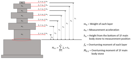 Second, the rocking of the 1F main body stone was investigated. The rocking effect due to the slenderness of the member might cause the overturning of a stone pagoda. When a stone pagoda is newly constructed, the slenderness of the member might be considered. However, when an existing stone pagoda is restored, installing doweled joints or vertical steel connectors between the members in Figure 12b,e can prevent the rocking and overturning.