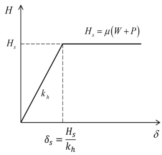 The critical horizontal forces required for sliding are shown in Figure 11. Here, P is the vertical force acting on a block, H is the horizontal force, W is the weight, is the displacement, µ is the friction coefficient of the contact surface, is the horizontal force when sliding occurs, is the horizontal stiffness, and is the displacement when sliding occurs. The normal force (P) acting on a block is the sum of the weights of the members above the block. Here, the weight of the tower body is the same in all models. Sliding occurs when the story-shearing force exceeds a critical value. However, as µ varies by the contact surface, it is difficult to estimate. We considered that sliding occurred when the maximum story-shearing force exceeded the horizontal force derived using a µ value of 0.6.