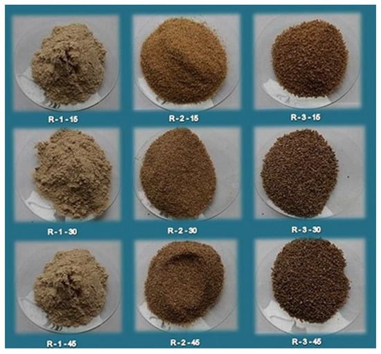 Corn grits and sugar beet pulp were mixed in ratios 85:15, 70:30, and 55:45. The chemical composition of used raw materials for the production of SBPEs was presented in our previous work [35]. Blended mixtures were conditioned to 30% of moisture, put in plastic bags, and left for 24 h before the extrusion. Prepared samples were extruded using the laboratory single screw extruder 19/20DN, Brabender, Germany. Extrusion parameters were as follows: compression ratio screw: 1:1; die: 5 mm; temperature profile: 70 °C in dosing zone, 90 °C in compression zone, and 100 °C in ejection zone; screw speed: 600 rpm; dosing speed: 40 rpm. Prepared extrudates were air-dried overnight at ambient temperature and stored in plastic bags. The extrudates were subsequently ground with an IKA MF10 laboratory mill and sieved through a laboratory sieve stack (BÜHLER, MLU300) to produce three fractions: fraction 1—particles < 250 μm; fraction 2—particles from 250 to 1000 μm; and fraction 3—particles from 1000 to 2000 μm. Thus, nine sugar beet pulp extrudates (SBPEs) were obtained (Table 1). The appearance of the SBPEs is shown in Figure 1.