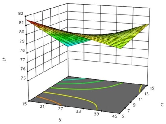 The influence of the interaction of factor B (percentage of sugar beet pulp in the extrudate) and factor C (percentage of wheat flour substituted with extrudate) on cookie lightness (L* value).