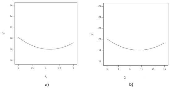 The extrudate particle size (factor A) also had a statistically significant effect on the yellow tone of the cookie surface (parameter b*). The quadratic member of this influence (A2) had a significance ratio of 23.06% (results not shown). Additionally, a similar proportion of significance (contribution of 22.86%) to this parameter had the square term of factor C (C2), that is, the share of extrudates in the cookies. The directions of influence of these factors on parameter b* are shown in Figure 3a,b.