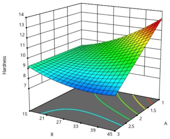 The interaction of factors A and B had a statistically significant effect on cookie hardness. This interaction is shown in Figure 4. Factor B has a greater influence on the cookie hardness when SBPEs with a smaller particle size are included in biscuit production (at lower values of factor A), and hardness rose with increasing sugar beet pulp content in the SBPEs from 15% to 45%. It was expected that factor B would have a greater influence on cookie hardness as sugar beet pulp contains a significant fiber proportion that absorbs water and can cause a more intense increase in cookie hardness. It is possible that during extrusion cooking, there was a modification that resulted in a smaller effect of factor B on cookie hardness. During extrusion, one part of the insoluble fibers pass into the soluble ones, as was reported in previous studies [50,51,52,53,54]. They explained that this effect could be the result of the breakage of covalent and non-covalent linkages between carbohydrates and proteins associated with the fiber, resulting in small molecular fragments, which would be more soluble.