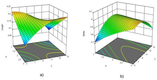 There was an increase in cookie length and a decrease in cookie width as compared to the control cookie sample (Table 5). Factors A and C—that is, their interaction—had a statistically significant effect on the length and width of cookies (Table 6), causing a slight cookie shape deformation. The directions of these impacts are shown in Figure 5a,b, respectively. With smaller shares of SBPEs in cookies (5%), the length decreased with increased SBPE particle size, while at higher SBPE proportion in cookies (15%), length increased as SBPE particle size increased. Flours with lower AWRC (as was the case with mixtures with lower particles of SBPEs and a lower amount of SBPEs (Table 2)) cause lower thickness and higher spread ratio of cookies [44].