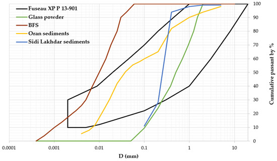 The morphological characteristics of the sediments were analyzed by a Hitachi S-3600 N scanning microscope. The thermogravimetric analysis (TGA) was carried out by a NESTZSCH STA 449F3 instrument and the mass loss depending on the temperature measurements between 105 °C and 1000 °C was registered [46]. The chemical analysis of the sediments shows that the percentage of silica is very high and calcium was relatively high, so this material was rich in Calcite (CaCO3). The alumina/silica ratio provides information on the permeability of the material. The greater this ratio, the greater the permeability [47]. In our case, this ratio was small: Al2O3/SiO2 = 0.1. The SiO2/Al2O3 molar ratio was greater than the conventional value for bentonite, which was 2.5. This difference indicates the presence of free quartz inside the clay fraction in huge percentage [34,36]. The overall composition of the other oxides (Fe2O3, MgO, K2O and Na2O) reached a percentage of 2.68 in the sediments from the port of Oran and 5.3 in sediments from the port of Sidi Lakhdar, which shows that the sediments were not pure [48]. Sediments with a relatively low molar ratio (CaO/SiO2) have a relatively high electrical conductivity. In addition, their flexural strength gradually increases with a decrease in the CaO/SiO2 molar ratio [49]. Loss of ignition (LOI) is the result of the calcination of powders up to 1000 °C. The high LOI was related to the presence of carbonates and the water evaporated by heat treatment. This result explains that the water retention due to the large capillarity of the large surface area. Texture analysis (Figure 2) to determine the particle size distribution was conducted by the wet sieving method [50].