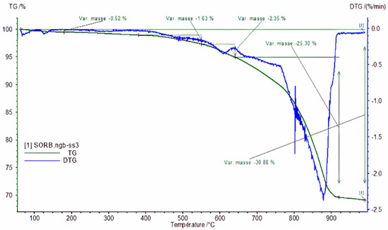 The third domain was between 540 °C and 630 °C. In this interval, the mass loss was 2.35% of the total mass of the sample. A greater mass loss of 25.3% was observed between 630 °C and 1000 °C, which was associated with an endothermic peak due to the decomposition of calcite (CaCO3) [55]. The DTA peak observed around 880 °C was attributed to this loss of mass due to the dehydroxylation of clay minerals. At 920 °C, the overall loss was around 29.8%.