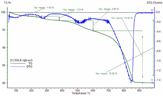 The last loss interval between 600 °C and 1000 °C on the TGA curve corresponds to a mass loss of 14.64%. This loss is associated with a peak DTA curve around 850 °C, and was due to the decomposition of carbonates and the release of CO2 [60].