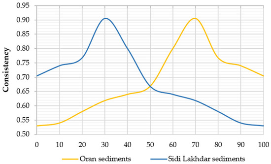 The samples were consisted of the following (Table 3): 400 g of sediment (70% sediment from the port of Oran and 30% sediment from the port of Sidi Lakhdar), depending on the consistency curve as a function of percentage of each sediment (Figure 6), glass with 4 moles of sodium hydroxide solution (this solution was left to stand for 24 h. 30 g of glass powder was mixed in 100 mL of this solution and left in an agitator for 8 h, and the same solution was made again with 40 g of glass), 40 g of BFS, and 40 g of clay.