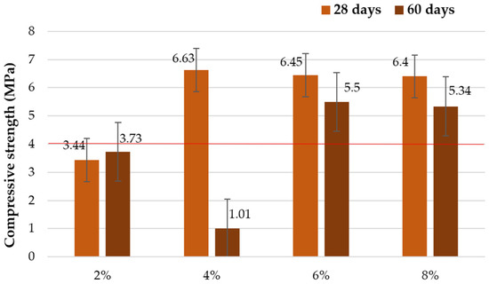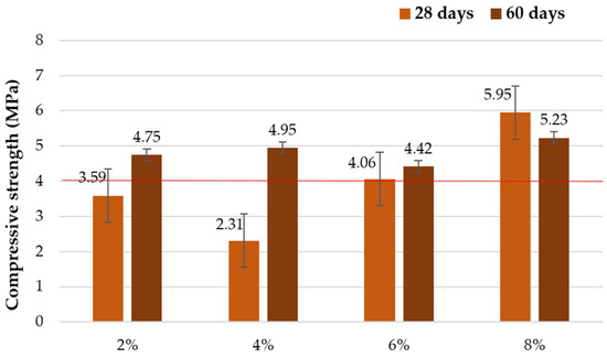 Samara et al. [68] considered compressive strength a good indicator of quality because it has a determining factor in the ability of a material to be used in construction. Simple compression tests were carried out on dry cylindrical test pieces by means of a mechanical press (INSTRON 30 kN). The speed of movement was 0.02 mm/s, corresponding to a pressure increase of 0.15 and 0.25 MPa/s, until the complete rupture of the test piece [51] (Figure 9 and Figure 10). The values obtained were the average of 3 samples for each formulation.