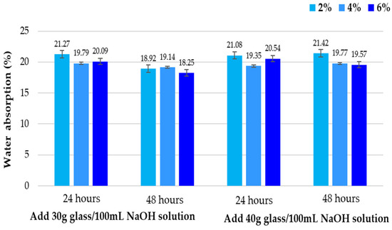 The absorption coefficient in the blocks which contained the 2, 6 and 8% solution was high due to the high porosity. The absorption coefficient increased as the bulk density decreased [71] but the blocks which contained 4% of glass with a soda solution were weakly capillary. These values were of same order as those found by Rivera et al. [72].
