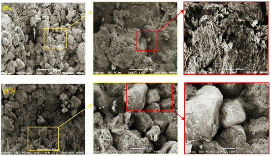 Table 6 shows the compaction densities of the blocks. Blocks containing 2% of 30 g/100 mL of solution have a less density at 2.62 g/cm3, while blocks containing 8% of 30 g/100 mL of solution and 6% of 40 g/100 mL of solution have the highest density at 2.75 g/cm3.