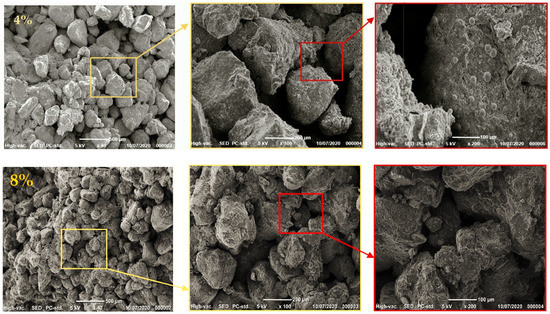 Scanning electron microscope (SEM) images of the mixture with 40 g/100 mL NaOH solution added.