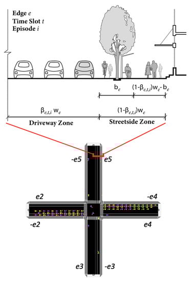 Consider a simple network represented by a bi-directed graph , where denotes the width of an edge and indicates the width of a facility belt. Let be the proportion of a driveway. As such, the width of the driveway equals , whereas the counterpart streetside has a width of (. Figure 3 highlights the spatial relationship among these variables, given a ROW plan of an edge. Provided a consecutive pair-wise AV traffic demands and pedestrian travel demand at , the problem is to optimise the driveway ratio of discrete edge and at each time slot, to improve travel efficiency of road users and a higher ratio of sidewalks.