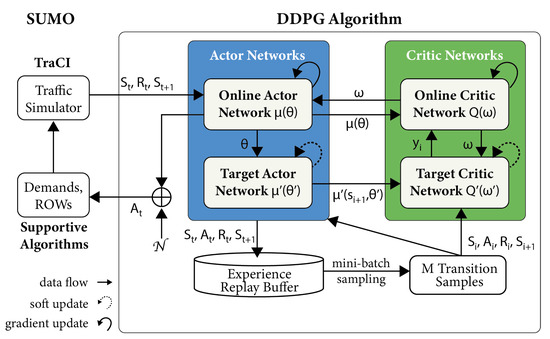 The action taken by an edge e at time step t is denoted as , representing the proportion of the link occupied by the driveway. Note that the action space of is continuous in a range of . Thus, the joint action space for the whole system is expressed using a -dimensional vector . Equation (27) expresses that the actor online network determines a deterministic action following the policy .