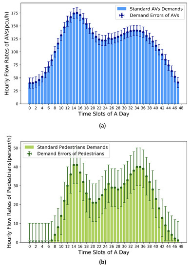 The hourly flow rates of AV transport and pedestrians are generated in alignment with the bimodal travel time distributions, following the description in [59]. A travel plan jointly synthesises pedestrian trips and AVs trips at the OD-pair level in 48-time slots of a day. Let and denote the vehicular and pedestrian travel demands per OD pair at time t. The sizes of AV fleets and pedestrians subject to corresponding travel plans, as expressed in Constraints (23) and (24).