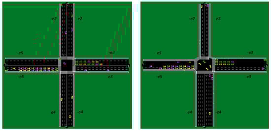 The prototypical road layout for testing originates from a four-legged intersection. This road layout has four 100 m roads comprising eight connected edges, . We have further calibrated this prototype into one symmetric layout case and an asymmetric case to ensure the usability of our proposed SUMO-DDPG model under varied geometric conditions.