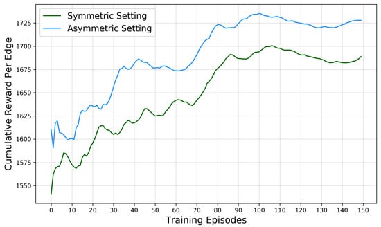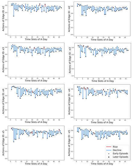 This DDPG is trained in 150 episodes and at the edges level, meaning discrete edges make individual decisions. One training episode comprises a number of time slots bounded by the starting time slot and 3600 s. Each time slot is equivalent to a length of min in the real world.