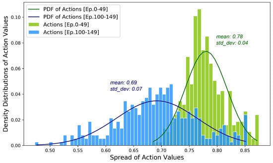 We further examined detailed transformation in distributions of actions. Figure 10 demonstrates the density distributions and their corresponding Gaussian Probability Density Functions (PDF). Optimised by our model, the actions’ density distributions get flattened throughout the training course. Their mean value transforms from 0.78 in the early stage to 0.69, shifting away from the upper limit and approaching towards the lower bound.