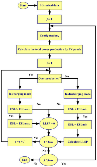 The operation strategy used in the proposed hybrid photovoltaic–battery system is presented in Figure 2. So, the calculation of the total power production by PV panels and the calculation of the energy storage in storage units as a back-up system to supply the electrical demand at lacking PV power generation times is performed through the loop below during a year (8760 h). Here, j is the number of the configuration of the hybrid system, which is determined based on the maximum number of PV panels, batteries, and the maximum number of iterations in the optimization algorithm.