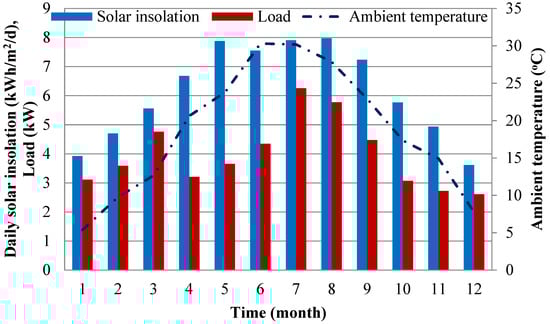Typical load demand, solar insolation, and ambient temperature during a year.