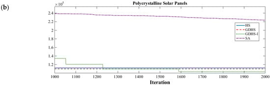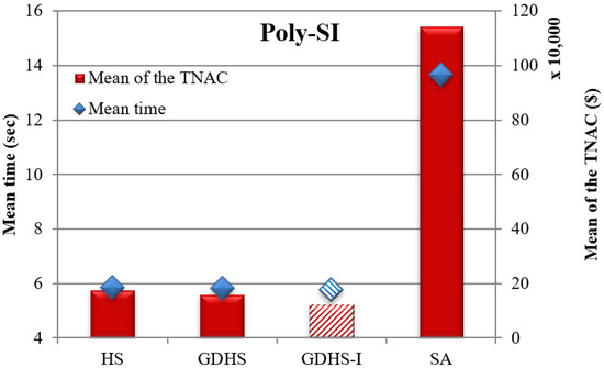 The optimization method is aimed at minimizing the TNAC value and the loss of load supply probability of the hybrid photovoltaic–battery system based on the optimum number of battery banks and area of the PV panels. The minimum bound of the battery banks and the area of the PV panels are set to 0, and the maximum bound of the battery banks and the area of the PV panels are set to 20,000 and 350 m2, respectively. In Poly-SI solar panels, the best fitness function value of the photovoltaic–battery system is USD 103,777, which is obtained by the GDHS-I algorithm. The subsequent ranks are displayed by GDHS, HS, and SA respectively. When utilizing the GDHS, HS, and SA methods, the minimum TNAC of the studied system is found to be USD 109,907, USD 112,175, and USD 223,570, respectively. The relative error between the Best index of the GDHS-I and GDHS, , is 5.9%, and between the Best index of the GDHS-I and HS, it is 8.1%. In addition, the relative error between the Mean index of GDHS-I and GDHS is 30.9%, and between the Mean index of the GDHS-I and HS, it is 45.3%. The best average simulation time value of the system is 5.7495 s, which is obtained by the GDHS-I algorithm. The worst average simulation time value of the system is 13.6854 s, which is obtained by the SA algorithm. Based on the mean and average simulation time indices, the result shows that the GDHS-I is better than the GDHS, HS, and SA methods (Figure 5). As a result, based on different indices (Best, Worst, Mean, Std., and Meantime), the GDHS-I method has more stoutness that the GDHS, HS, and SA methods, respectively. The convergence characteristics of the GDHS-I, GDHS, HS, and SA algorithms for Poly-SI solar panels are presented in Figure 6, which shows the superiority of GDHS-I in finding the best fitness function value.