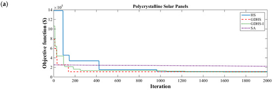 As the harmony search method uses stochastic random searches in the search space, various runs may lead to finding various solutions. To solve this problem, the optimal solution is reported after several runs. In this regard, 30 independent runs for each algorithm (HS, GDHS, SA, and GDHS-I) are executed to provide valid results, and the optimal results are determined. These results for two types of solar panels (Poly-SI and Mono-SI) are reported in Table 3, which includes the average, worst (maximum), best (minimum), and standard deviation (Std.) of the TNAC value and the average simulation time indices.