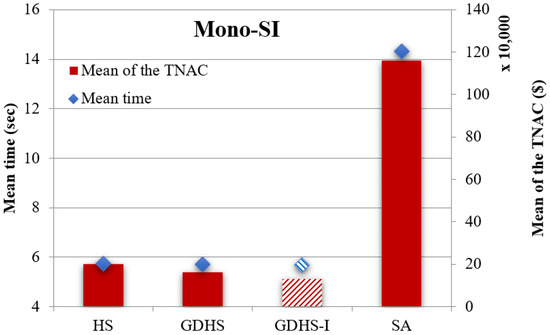 In Mono-SI solar panels, the minimal TLCC, which denotes the optimal setup, is USD 104,686, which is found by the GDHS-I algorithm. The subsequent ranks are displayed by GDHS (USD 105,580), HS (USD 111,413), and SA (USD 138,654), respectively. The relative error between the Best index of the GDHS-I and GDHS is 0.9%; between the Best index of the GDHS-I and HS it is 6.4%; and between the Best index of the GDHS-I and SA it is 32.45%. In this case, the Mean, Worst, and Std. values of the fitness function are USD 129,355, USD 198,360, and USD 22,191, respectively, which are obtained by the GDHS-I algorithm. In this regard, the relative error between the Mean index of GDHS-I and GDHS is 25.5%, and between the Mean index of the GDHS-I and HS it is 56.1%. The mean simulation time value of the system is 5.6776 s, which is obtained by the GDHS-I algorithm. The mean simulation time and the mean fitness function values with the proposed algorithms for Mono-SI solar panel are shown in Figure 7, which shows the superiority of GDHS-I based on the mean simulation time and the mean fitness function values. Figure 8 shows the convergence characteristic of the GDHS-I, GDHS, HS, and SA algorithms for the Mono-SI solar panels. It can be seen that the GDHS-I method is better than other methods in finding the best fitness function value.