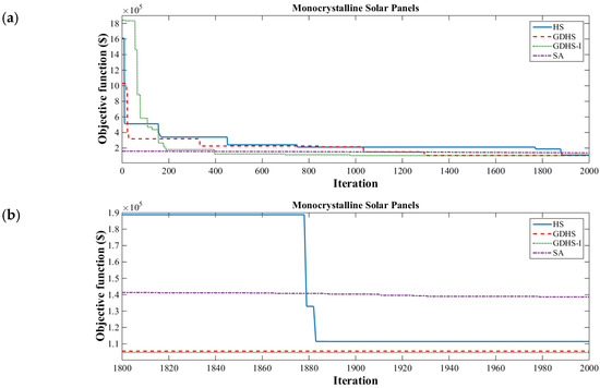 (a) The convergence characteristic of GDHS-I, GDHS, HS, and SA algorithms for Mono-SI solar panel; (b) zoomed in part.