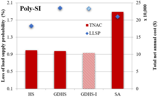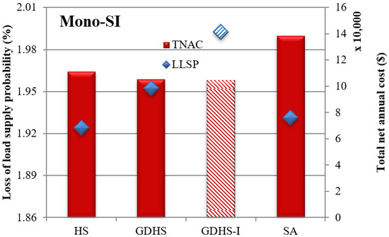 The optimal configurations of the hybrid photovoltaic–battery scheme for different types of solar panels (Poly-SI and Mono-SI) by the proposed algorithms are reported in Table 5. In Poly-SI solar panel, the optimal number of battery storage, and area of the PV panels, TNAC, and LLSP, found by GDHS-I, are 1088, 147 m2, USD103,777, and 1.9644%, respectively. It is observed that when using GDHS, the values of TNAC and LLSP increase to USD109,907 and 1.9824%, respectively. It can be seen that the values APV and NBS are 146.2 m2 and 1155 in this case. When the HS algorithm is used, the optimal number of battery storage, and area of the PV panels, TNAC, and LLSP are 1179, 149.2 m2, USD112,175, and 1.5612%, respectively. Also, when the SA algorithm is used, the optimal number of battery storage, and area of the PV panels, TNAC, and LLSP are 2395, 139.4 m2, USD223,570, and 1.7805%, respectively. The TNAC and LLSP values with GDHS-I, GDHS, HS, and SA algorithms for Poly-SI solar panels are shown in Figure 9. Among the results of the four algorithms, it is observed that the optimal configurations of the hybrid photovoltaic–battery scheme with the lowest cost (USD103,777) and appropriate reliability are obtained by the GDHS-I algorithm. In this regard, in the highest allowable value of LLSP (here 2%), the GDHS-I shows approximately 5.6% & 7.5% cost saving in comparison with the GDHS & HS, respectively. Also, the GDHS-I shows approximately USD 119,793 cost saving in comparison with the SA algorithm.