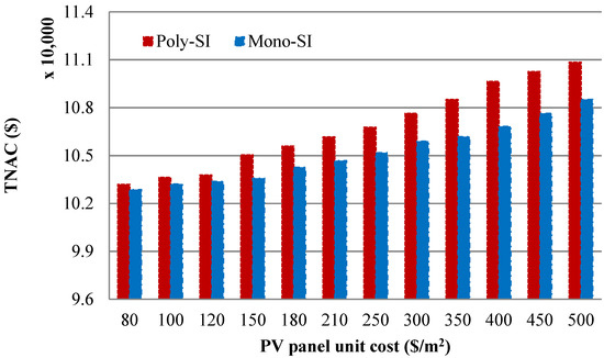 In this section, first, the effect of the PV panel unit cost on the optimal system is investigated, and then the effect of the PV panel efficiency on the optimal hybrid system is analyzed. The optimal configurations of the hybrid photovoltaic–battery system for different types of solar panels for different PV panel unit costs are reported in Table 6. In Mono-SI solar panels, when the PV panel cost is equal to 210 USD/m2, the optimal values of the TNAC and LLSP of the hybrid scheme are USD 104,686 and 1.9924%, respectively. In addition, the values of APV and NBS are 110.1 m2 and 1093, respectively. When the PV panel cost is equal to 150 USD/m2 and 300 USD/m2, the optimal values of the TNACs of the hybrid system are USD 103,586 and USD 105,889, respectively. It is observed that by reducing the PV cost from 210 USD/m2 to 150 USD/m2, the value of the TNAC decreases to 1.1%, and by increasing the PV cost from 210 USD/m2 to 300 USD/m2, the value of the TNAC increases to 1.2%. In Poly-SI solar panels, when the PV panel cost is equal to 210 USD/m2, the optimal values of the TNAC and LLSP of the hybrid system are USD 106,167 and 1.9078%, respectively. In addition, the values of APV and NBS are 147.41m2 and 1096, respectively. It is observed that by reducing the PV cost from 210 USD/m2 to 150 USD/m2, the value of TNAC decreases to USD 1120, and by increasing PV cost from 210 USD/m2 to 300 USD/m2, the value of TNAC increases to USD1470. As a result, by increasing the Mono-SI solar panel and Poly-SI solar panel unit costs, the TNAC of the hybrid system is increased (Figure 11). A comparison between the Mono-SI and Poly-SI solar panels shows that, at the same cost, the optimal values of APV and TNAC of the hybrid system based on Poly-SI solar panels is more than the hybrid system based on Mono-SI solar panels. In other words, the hybrid system based on Mono-SI solar panels shows about a 37% APV saving in comparison with the hybrid system based on Poly-SI solar panels. In addition, the hybrid system based on Mono-SI solar panels shows about 1.5% cost savings in comparison with the hybrid system based on Poly-SI solar panels. The reason for the difference in cost, despite the same cost, is the difference in efficiency between the two panels.