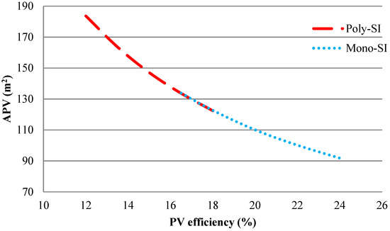 Area of the PV panel of the hybrid scheme vs. PV efficiency in the optimal condition for Mono-SI and Poly-SI solar panels.