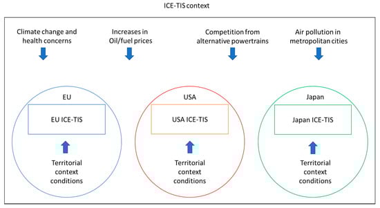 Finally, further research is needed to establish a causal relationship between the changes in the context, the TIS structure, territorial particularities and the choice of the dominant technological trajectory. Arguably, among a wide range of possible factors in the territorial TIS structures, we emphasised policy regulations as the primary driver for the difference in the technological trajectories across the examined territories. However, there are certainly other important factors in the territorial TIS, such as the initial bad image of the diesel engine in the USA and Japan or the denigration of diesel technology by major Japanese carmakers [18,19,87], which could be responsible for the disparity in the technological trajectories. Additionally, there is also further potential to put a greater emphasis on context structures like competing or complementary TIS or a stronger focus on the ICE-TIS itself by means of a finer delineation between the gasoline, diesel, and hybrid powertrains. This would allow to further differentiate the influence of context changes on the respective technological applications and their interrelated development dynamics [40]. Besides examining other factors, the linkages between the focal TIS and its context have to be investigated in greater detail as well [3].
