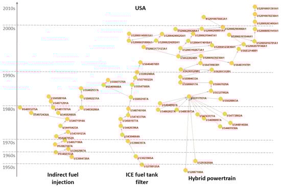 In the picture, the trajectories are ordered horizontally according to the periods in which the trajectories were calculated, with the left trajectory being the earliest one. In addition, we ordered the patents according to their granted date on the vertical axis, with the oldest patents at the bottom. Furthermore, to provide a more concise picture, we excluded the endpoints of each trajectory that have a common ancestor because they have no forward citations and thus do not contribute to the SPC weighting [21,74]. The first trajectory on the left was calculated for the time period 1978–1995. It entails patents about ICE fuel injection and fuel metering systems. Specifically, almost all patents in the trajectory are specialized on fuel injection valves and nozzles for gasoline-manifold fuel injection (e.g., Patents US3662987a, US3967597A, US4057190a, US4247052A, US4310123A, US4416423A, US4572436A, US4582085A, US4817876A, US4830286A, US5002231A).