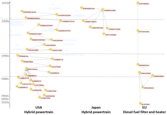 Figure 3 depicts the global main paths for the EU, USA, and Japan. The dominant trajectory for the USA is depicted on the left and is equal to the latest trajectory in Figure 2. As before, the trajectory represents the knowledge search process concerned with the application of the ICE in hybrid vehicles (e.g., Patents US2008093141A1 and US2005016781A1). Likewise, the trajectory for Japan in the middle of Figure 3 consists of patents for hybrid vehicles (e.g., Patents JP2006118681A and JP2010202151A). Notably, almost all patents in these two trajectories are from Japanese firms, demonstrating their dominant position and technological advantage in the hybrid vehicle market [15]. Next, we consider the development of the Japanese trajectory over time. When taking patent data up to the end of 2000 and 1990, the respective results point to knowledge search processes that are concerned with diesel technology. Indeed, these trajectories represent the high share of diesel cars in Japan during the 1990s, which we already pointed out in the historical description of the ICE. By the same token, the succeeding shift to the hybrid powertrain trajectory exemplifies the choice of policymakers to phase-out diesel cars on the Japanese car market.