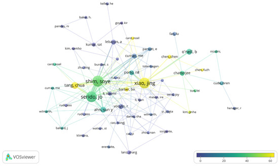 The graph (Figure 3) shows a high publication level of the authors Serido J./Univ Minnesota (16 articles), Shim, J./Univ Wisconsin (17 articles), and Xiao, J. (16 articles), highlighting the prominence of this last author who achieves an average citation of close to 60 articles (921/16 = 58).