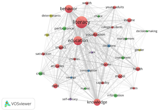 Finally, according to Zipf’s Law, three thematic clusters are identified that evince semantic differences. As represented in Figure 5, they are: (1) education, literacy, socialization, college students, income, behavior, and impact (red color); (2) investment, management, decision making, and credit (green color); (3) consumption, decisions, scale, and savings (blue color).