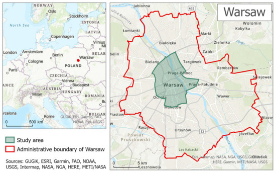 The research area in this study was the central part (the city) of Warsaw and adjacent districts (Figure 1).