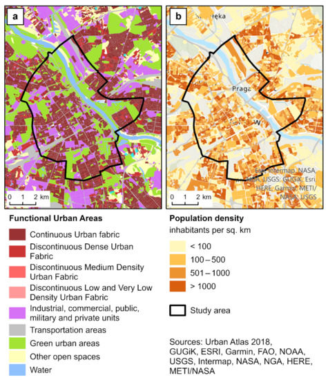 (a) Functional Urban Areas [46] and (b) population density [47] in the study area.