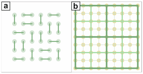 Square shaped Perfect City in two variants: (a) with local routes that are not interconnected city-wide, (b) with a full system of cycling links.
