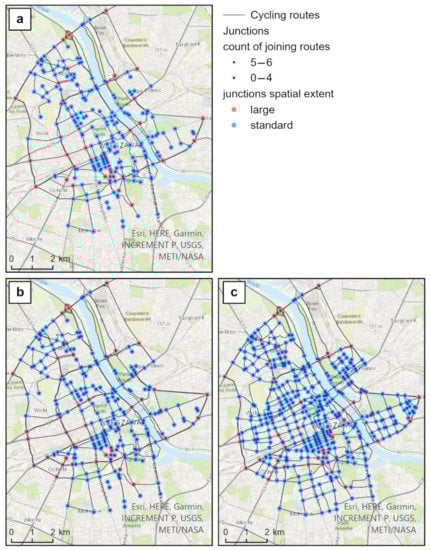 The current condition of the bicycle network and the two scenarios of its development are presented in Figure 4a–c and Figure 5a–c. Figure 4a–c describes the connection points (routes intersections) within the network. “Large” nodes refer to cycle route junctions connecting 5–6 roads, with tram passageways and more than one lane in each direction. Standard intersections are typical crossings, connecting minor streets in up to four directions.