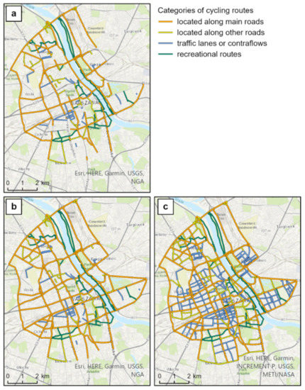 Figure 5a–c shows the routeing system by solutions used depending on the road importance. There are four main types of bicycle routes: located along the main roads, other roads, traffic lanes/contraflows, and leisure routes. The leisure routes go mainly along the Vistula River and city park zones. Therefore, it is possible to consider connecting them to the system of other cycle routes in Warsaw without extending the existing recreational routes.