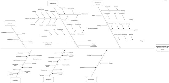Ishikawa diagram summarizing the cause-and-effect relationships of the variables that affect CQAs in the development of the formulation with C. sativa shells extract.