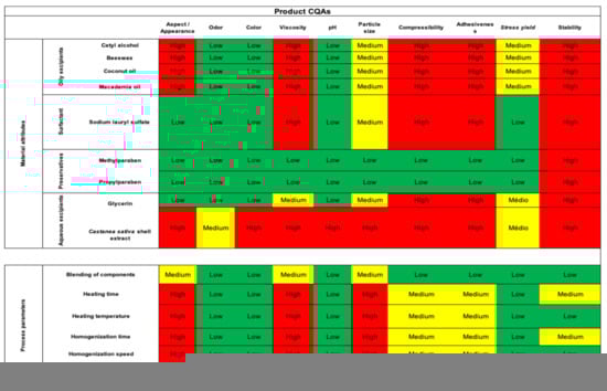 Evaluating this risk matrix, it is possible to visualize information about a certain set of risks, in addition to the possibility of concluding which risks should be prioritized. For the elaboration of the risk matrix, the correlation between the CQAs and the material attributes and process parameters was built, with the risks being assessed and classified individually by considering the probability of occurrence and the impact. A combination of values was used on a scale from one to five, with five representing a very high risk, four a high risk, three a medium risk, two a low risk and one a very low risk. Values were calculated and ordered in a risk classification system with high (red), medium (yellow) and low (green) priority. In general, through the initial risk analysis, it is possible to conclude that the product’s aspects, such as viscosity, droplet size, adhesiveness, and compressibility, highly influence the CQAs.